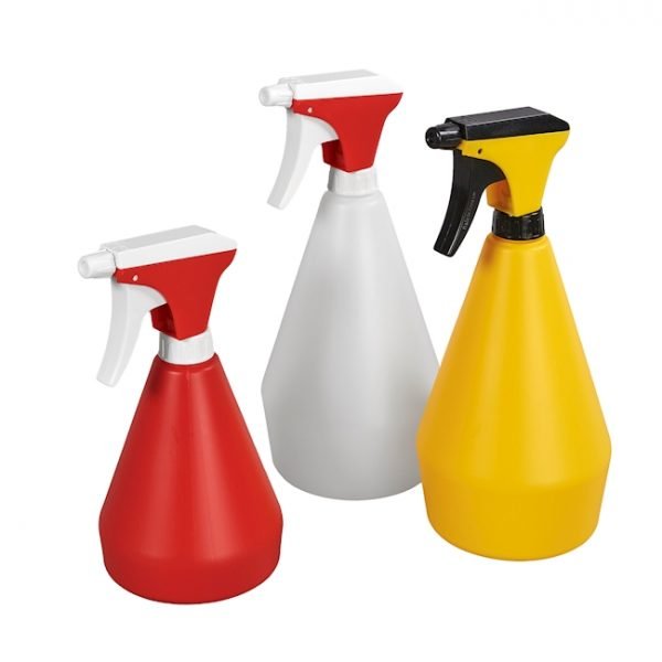 In robuster, handlicher Ausführung, gut stehend. Flasche aus PE-HD, Sprüh-Kopf und Düse aus PP und PE, daher gut chemikalienbeständig auch gegen aggressive Medien. Düse durch Drehung vollständig absperr- oder verstellbar, von ganz feiner Zerstäubung bis zu einem schmalen, kräftigen Sprühstrahl.